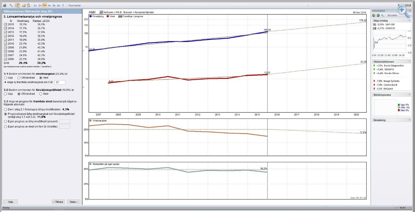 I det här steget så gör du en lönsamhetsanalys och en vinstprognos för de kommande fem åren. Syftet med hela analysen är att komma fram till rimliga värden för framtida vinst och värdering för aktien som du analyserar. I steg 3 gör vi klart prognosen för vinsten, och är alltså ett av de två viktigaste stegen i analysen. Så ta sig god tid att göra egna bedömningar. Det här steget upplevs ofta som det svåraste i analysen, men med lite erfarenhet kan man snabbt komma fram till rimliga värden.