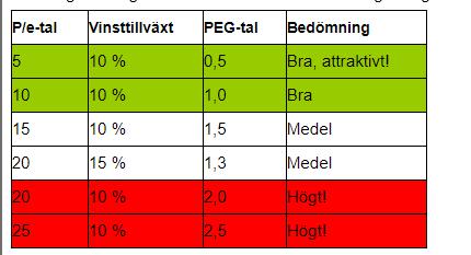 Ett stöd för bedömningen av vinsttillväxten är PEG-talet. Det är aktuellt P/e-tal dividerat med vinsttillväxten. Ett PEG-tal över 2,0 är mycket högt medan ett PEG-tal under 1,0 är attraktivt. Ett annat sätt att säga samma sak är att P/e-talet inte bör vara större än vinsttillväxten för att vara attraktivt. Och det får aldrig överstiga dubbla tillväxttakten. Tabellen ger några exempel: