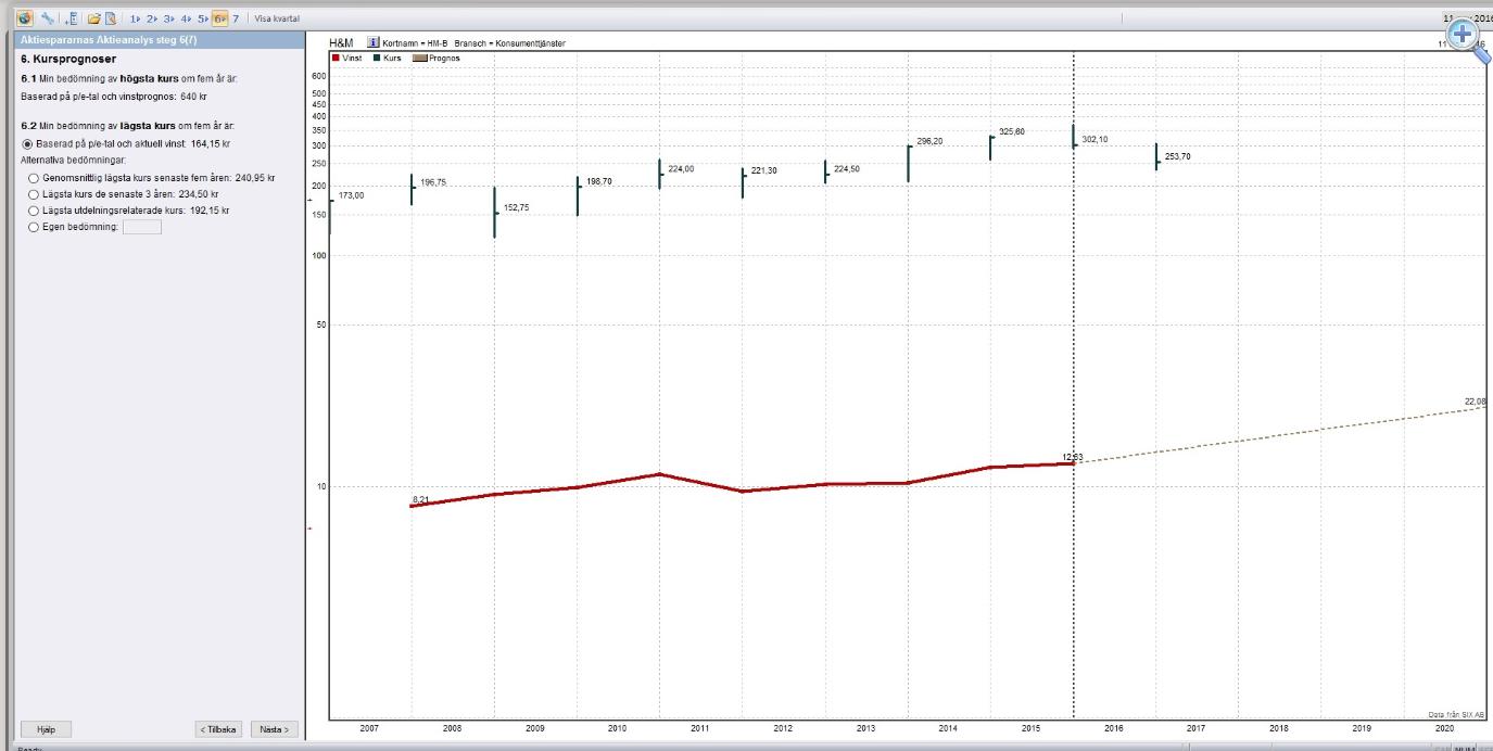 I det här steget så gör du en prognos av kursen om fem år baserat på dina tidigare bedömningar. Med stöd av det så kan du snart se ifall det är tid för att köpa, sälja eller behålla. I diagrammet ser du liksom i tidigare steg aktiekurserna för de föregående åren (samma som i steg 5) samt vinstprognosen (samma som i steg 3 och 5).